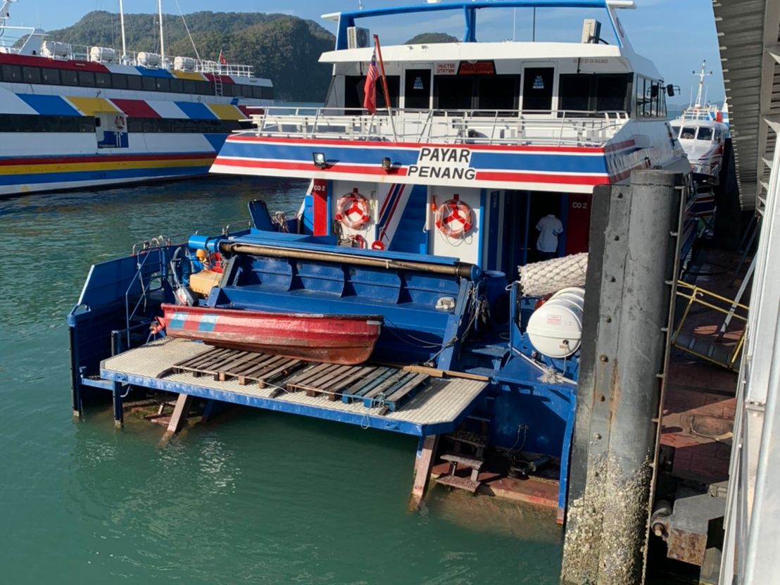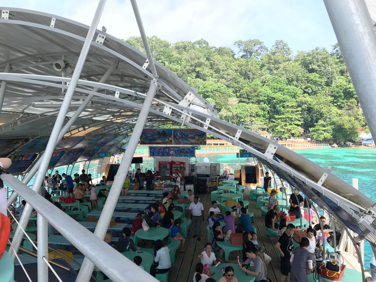 このツアーでのポイントはポンツーンでの席の確保です。ランカウイとペナンから2~3隻のフェリーがポンツーンに到着するようです。私たちのフェリーは1隻目だったのでまだ席はガラガラでしたが、フェリーが到着するたびに中国系の人たちでポンツーン内が埋め尽くされます。