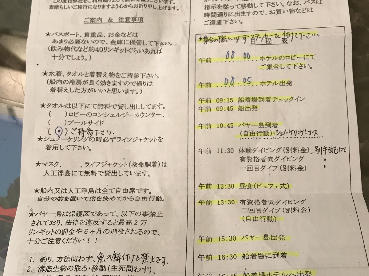 パヤ島ツアーには日本語ガイド付きもあるようですが、このツアーに関しては日本語ガイド無くても大丈夫です。前日ホテルに案内の手紙が届いていて、それがあれば十分です。ただ日本語ガイドがいれば席番してくれるので、上述の中国系の人たちに席を取られる心配はありませんが。