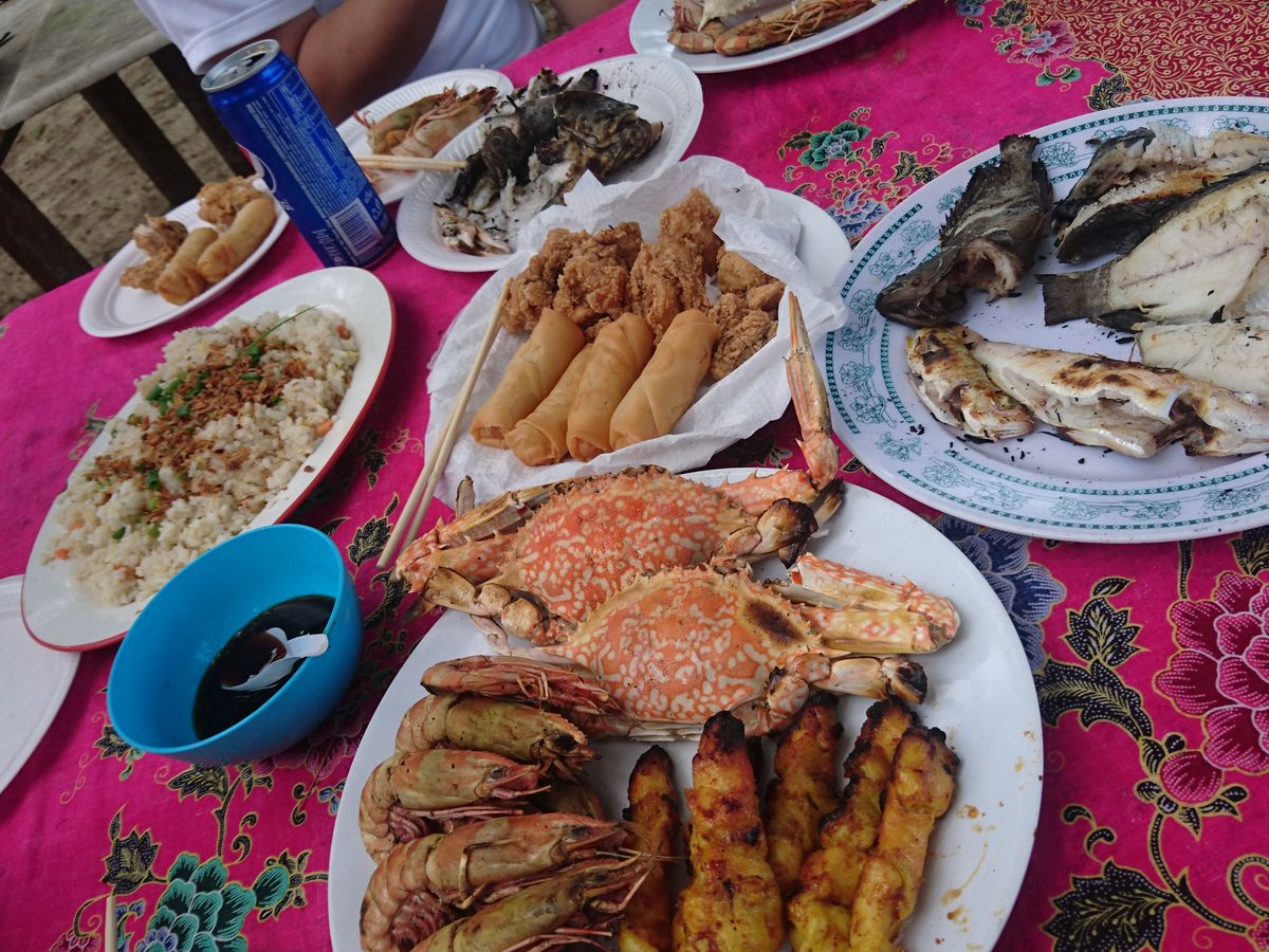 さらに夕食(5)。マングローブの森の中に浮かぶ養殖場兼レストランで、今さばいたであろう魚が丸々焼かれて出てきました。他にも色々と。ボリューム◎。
