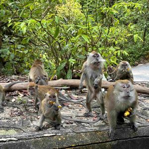 ペナンヒル観光では、四駆車に乗り換えて、急坂を一気に駆け上がり、ペナンヒルホテルから景色を楽しみました。帰り道では野生サルが集まってきたので、運転手さんが用意していたバナナをやりました。