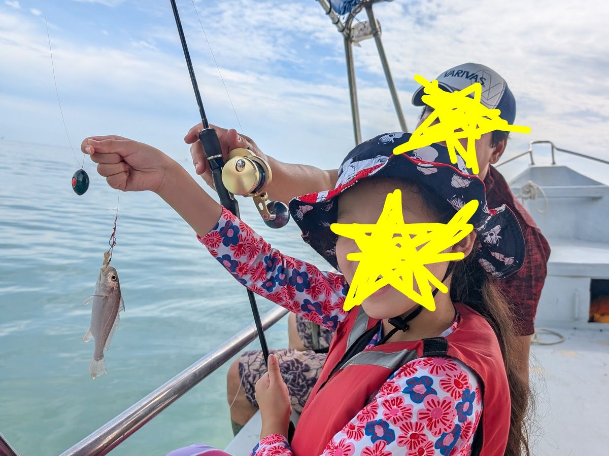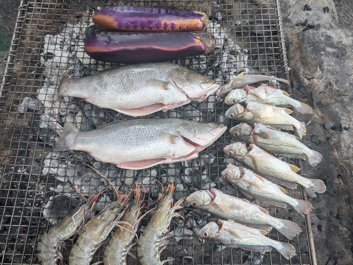 釣果はあまりよくなかったけれど、イシモチやゴンズイが釣れて、イシモチはBBQで炭火塩焼きしてくれ、あとはエビやタイ、焼きなす、ナシゴレン、ドリンク、フルーツを提供してくれて、のんびりした美味しくていいランチでした。