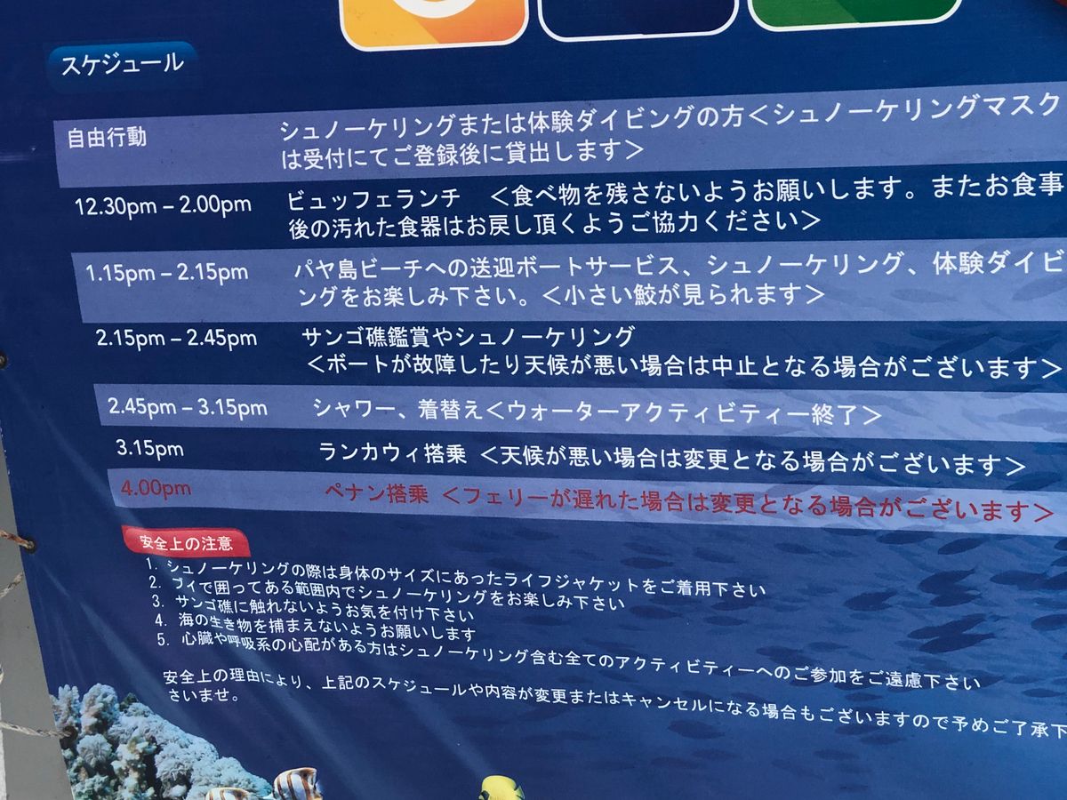 そして、いざ当日、ホテルの前までバスで迎えにきてくれました。そこから港まで行き、フェリーに乗ること約2時間ほど、島につきました。島についてすぐ中国人がたくさんやってきて圧倒されました笑 島には日本語でダイビングの際に気をつけることなど書いてありわかりやすかったです。インストラクターの方に鼻に空気が入った際