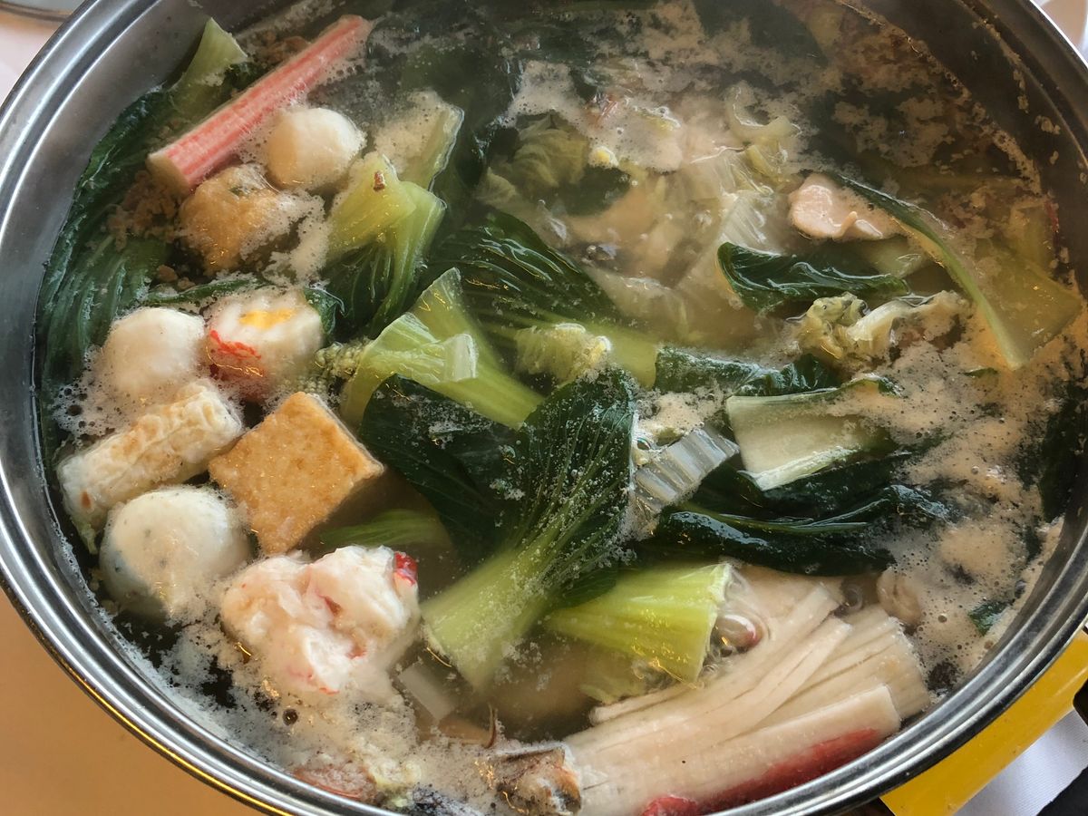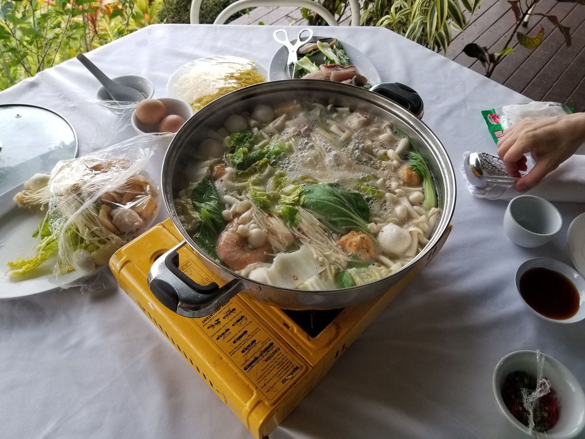 丘の上なので、涼しく、屋外テラスで鍋を食べてても不快ではなかったです。スチームボードはおでんのような練り物が多く、スープは薄味であっさりしていました。