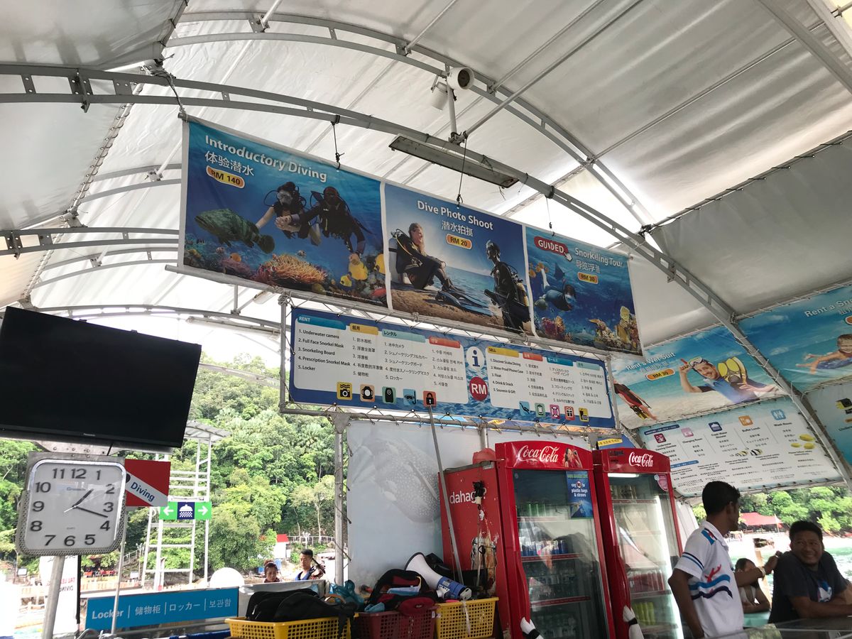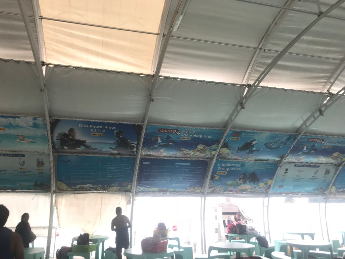 ポンツーンは聞いていたよりも揺れが少なく快適でしたが、なみの荒いときにはかなり揺れそうです。ライフジャケットやシュノーケルは無料で比較的綺麗なものが沢山準備してあり、水道(一応シャワー)や更衣室・トイレもあります。飲み物やカップ麺、ちょっとした必需品を売っている小さな売店も有りましたし、借りられないと聞いていたウェットスーツも、ポンツーン内で安く貸し出ししていました。ランチはその場でどんどん作っていて美味しく温かいお料理が十分に出ます。気の利いた沢山のスタッフさんが陽気かつキビキビと働いていて、臨機応変に対応してくださり不便な思いは全くしませんでした。