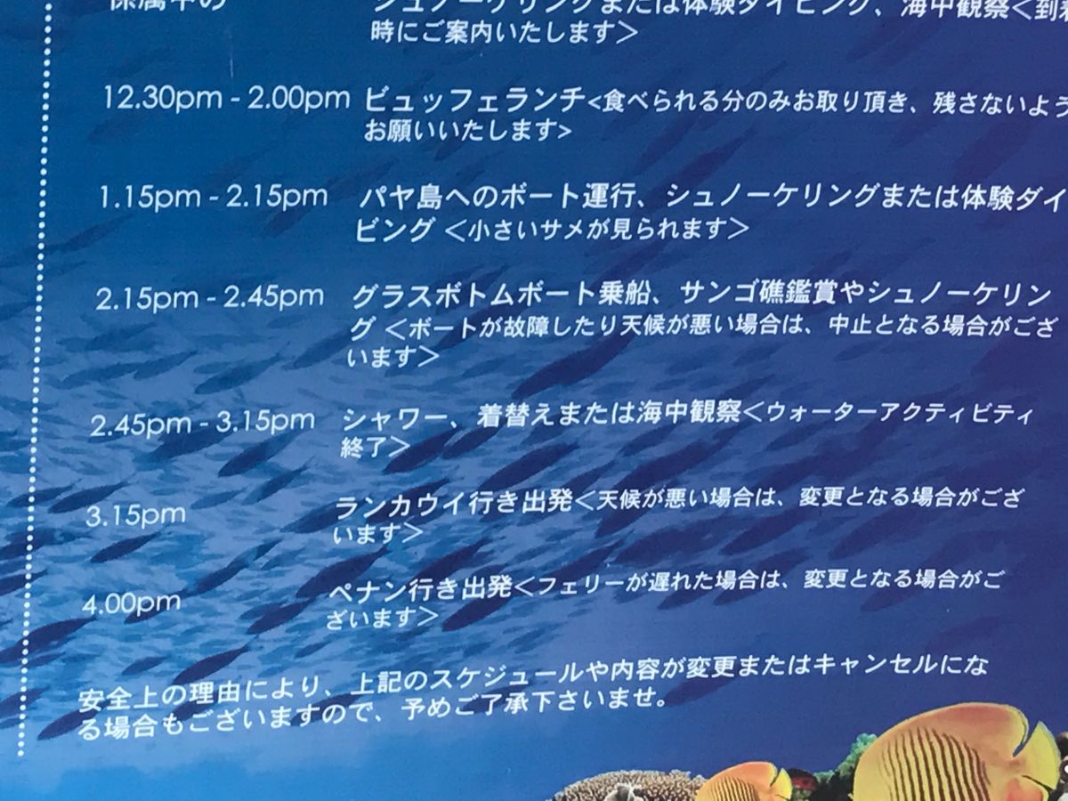 ただ、パヤ島はとても綺麗で魚もいっぱい。シュノーケリング、最高でした。昼ご飯は取り放題ですが、8種類くらい(デザート別)しかありませんでした。味は普通でした。