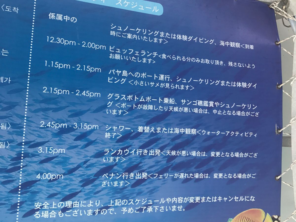 船の中は冷房がかなりきいてるのでなにか羽織りものがあるといいです!!パヤ島までは思ってた以上に遠かったですが、海はとてもきれいでした!魚もたくさんいたし、サメも見れました!!のんびりしたい(ほとんど自由時間でした)、きれいな海見たい方はぜひおススメです!