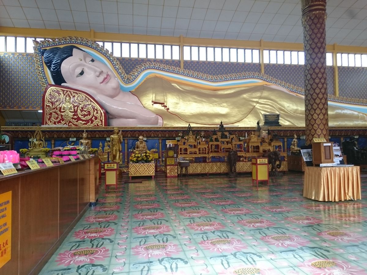 ですが、寝釈迦仏寺院に行ったところ、寺院の方に中国のドラマの撮影で「見学NG」と言われ、「え、なんで事前に分からなかったの!?」となりましたが、ガイドの「サムさん」が15分くらい交渉した結果、「寝釈迦仏の建物の手前からの写真だけならOK」となりました。写真は門のところから手を差し入れて撮った写真です。寝釈迦仏を間近に見られなかったのは残念でしたが、「サムさん」がいなかったら寺院の中に入ることもできなかったので、感謝しています。
