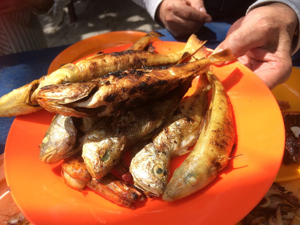釣った魚のほか、イカやエビ、鶏肉が食べきれないほど出てきました。