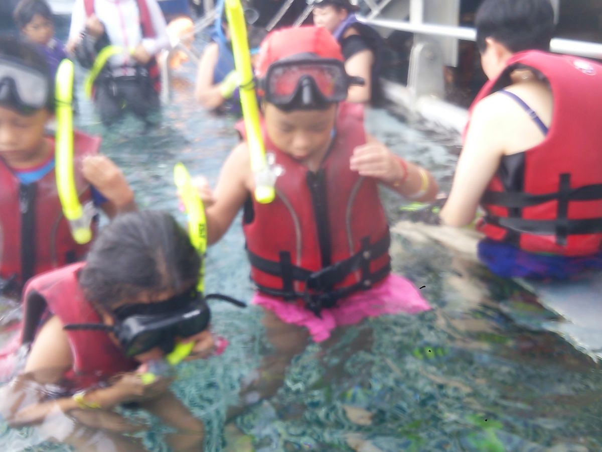 シュノーケリングは、とくに難しいことがないためか、インストラクターはおらず、お好きにどうぞ、的な感じでした。なので、最初の説明(英語)を聞き逃すと、どうしたらいいのか分からなくなるかもしれません。シュノーケリングの方は、ゴーグルとシュノーケル、ライフジャケットを受け取り、海に潜る(浮かぶ)だけです。ちなみに、フィンの