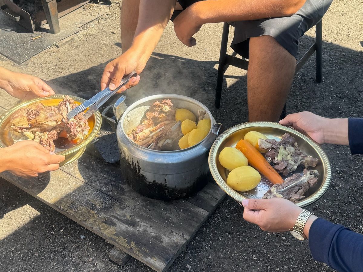 - 現地のゲルの方が振る舞ってくださった羊肉の石焼は絶品です。ビールとすごく合います。