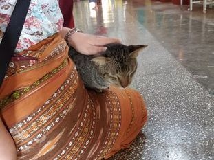 渋滞がなかったので、予定より早く全ての工程が終わってしまったのですが、こちらの希望でもう一度ネコがいるチャウタッジーパゴダに行ってもらいました。2度目の訪問では、ネコがたくさんいてネコ好きの我々はネコと触れ合って楽しいひとときを過ごしました。1匹のネコが膝に乗ってきて、懐いてくれました。この時お坊さま、セキュリテイの方とも言葉は通じなくても交流することが出来たことも良い体験でした。