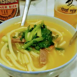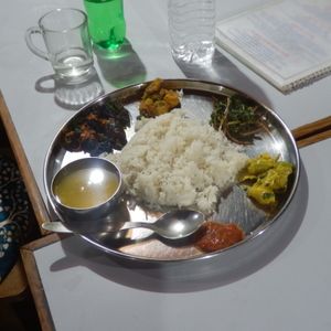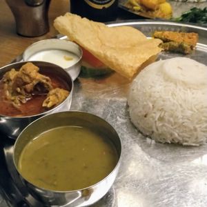 食事はダルバート(豆カレー定食)が美味しく、別注でネパールビール、ネパールワイン、モモ(餃子)を頼みました。