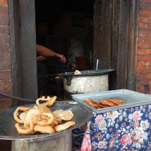 バグタプルの街はとても良かった。カトマンズに比べてとても落ち着きがあって歴史が感じられるよい街です。ツアーだと車で移動して見所だけを下車観光と言うパターンが多いですが、ここは街の中心部をすべて徒歩で歩いて巡ります。見どころだけではなく普通の街中の様子が感じられてよかった。途中で地元の店で駄菓子のようなものを食べたけど揚げたてでとてもおいしかった。絵画や金属ボウルのお店でも色々話が聞けました。売り込みがしつこくなかったのも好感が持てます。