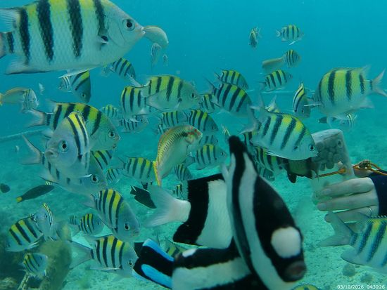 1島目、オランゴ海洋保護区は、エメラルドグリーンが美しい、セブ島屈指のダイビングポイント。色とりどりの魚たちに会いに、海へ飛び込みます。