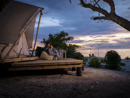 ジンベイザメ宿泊ツアー シュノーケリング+スミロン島グランピング 星空の下のキャンプファイヤー 選べるカワサン滝キャニオニング有<日本語可/4食付/3~9月>