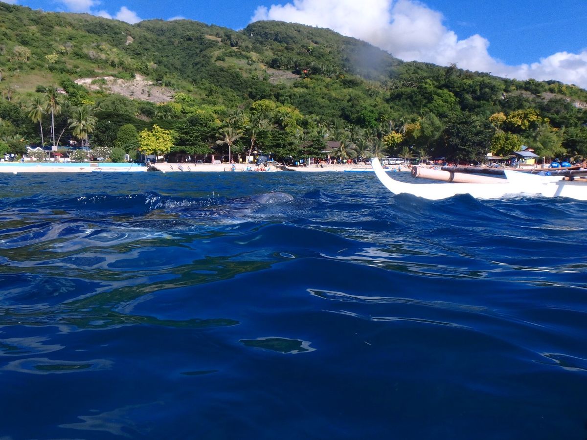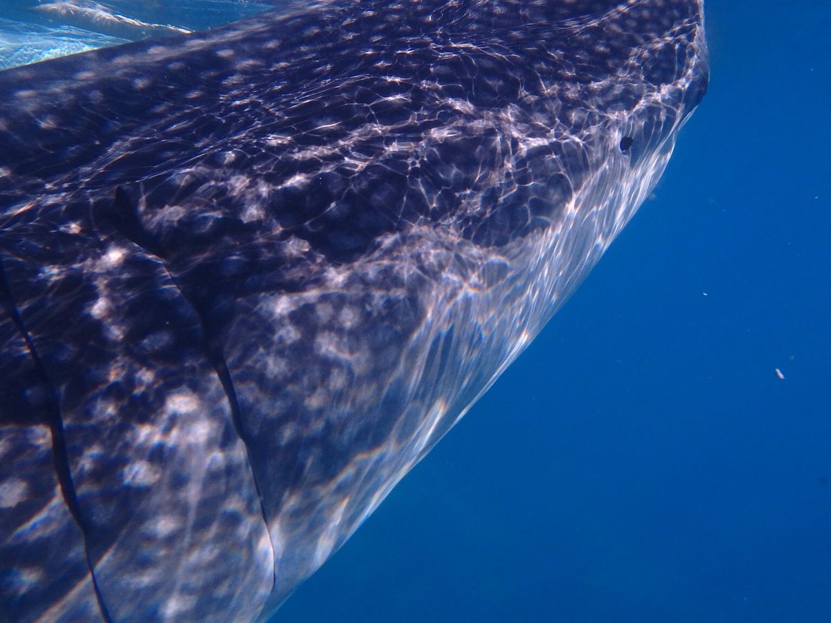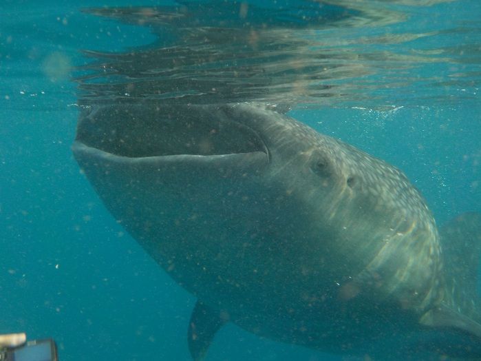 水中を見ると、もうすぐそこに、ジンベイザメがぁ!即効潜りました。