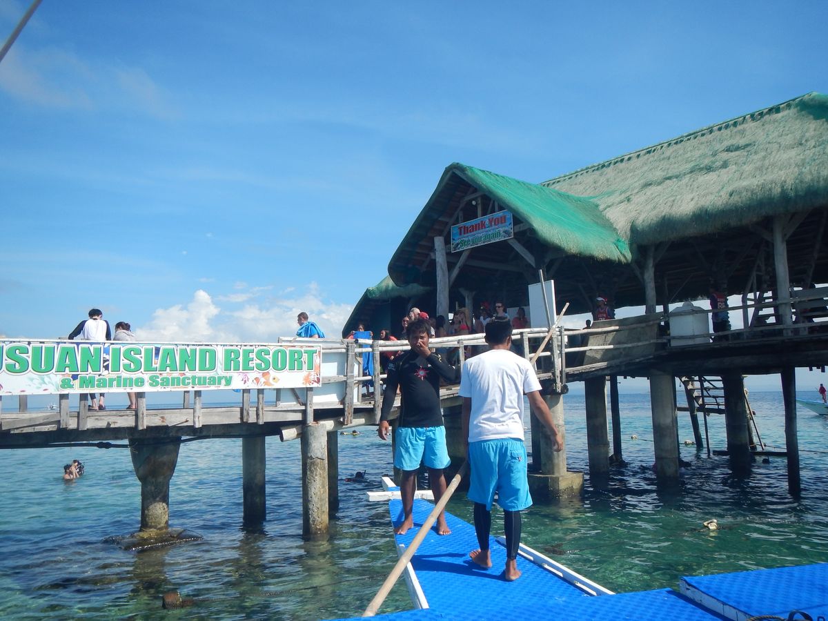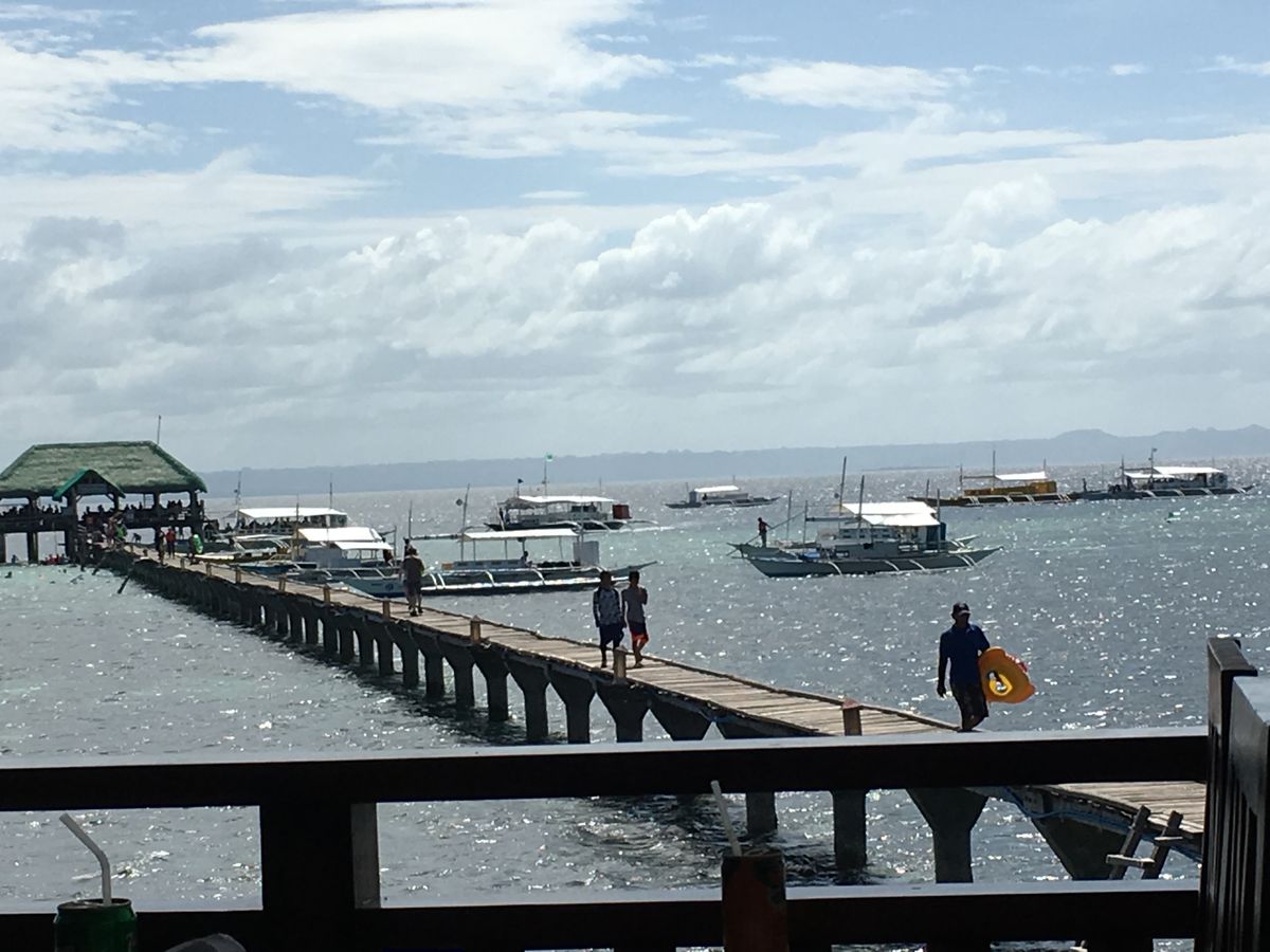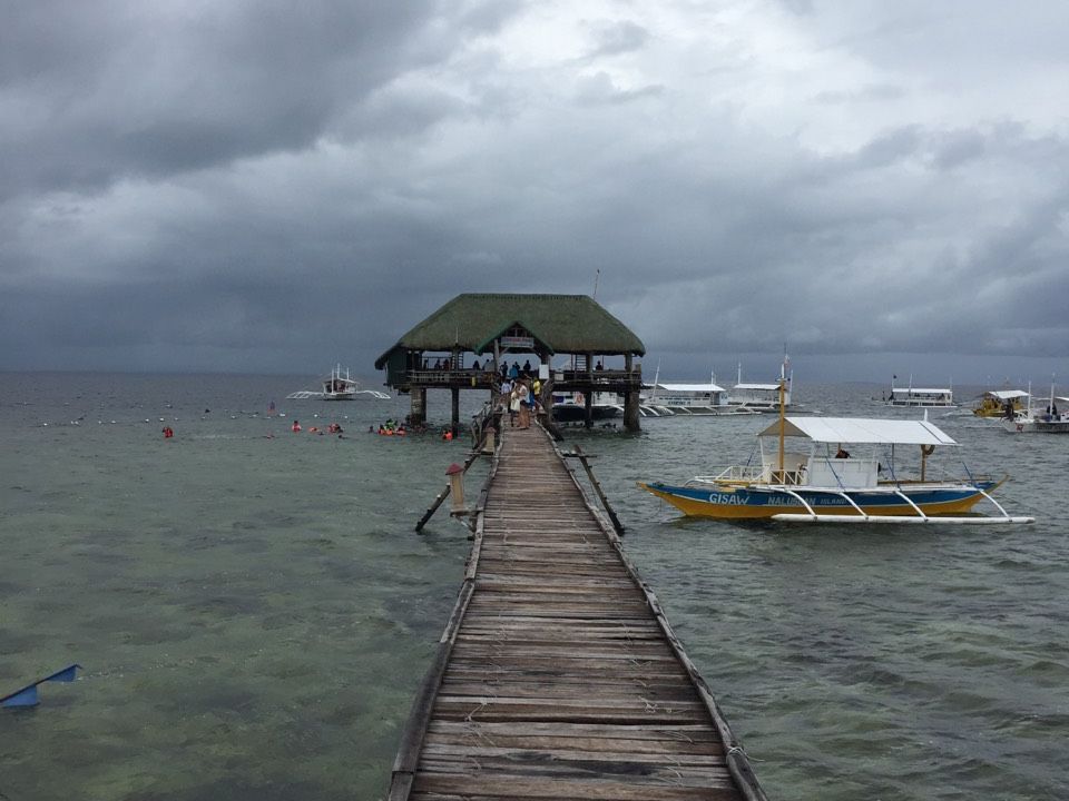 前日の夜から朝方まで降り続いた雨が上がり、8時30分、時間通りに待ち合わせロビーに現地ガイドさんが迎えに来てくれました。参加者は僕たち2人と3人の若い女性グループ。計5人でジプニーに乗り込み港を目指します。ボートに乗り換え30分程走り、沖に出てシュノーケリングを満喫。主な装備はすべて用意してくれています。僕の相方は持参のシュノーケリングセットでしっかりセブの海を楽しんでいました。シュノーケリングを楽しんだ後は、ボートで15分程離れた島に上がりBBQです。それまでフィリピン料理を食べていなかったので、ここで初めてフィリピンらしい料理を食べました(このレストランのトイレは綺麗ですよ)。昼食後は自由時間となり島をブラブラしたり、ハンモックで昼寝したり、浅瀬で写真を撮ったり思い思いの時間を過ごせます。ちなみにこの島は、石を投げれば韓国人に当たるくらい韓国人だらけでした。その後は桟橋の下で再びシュノーケリング。こちらの方が透明度が高く綺麗だったように思います。また、こちらは浅い海なので深いところが苦手な方や初心者でもきっと安心して楽しめる筈です。ツアーの流れはこんな感じです。