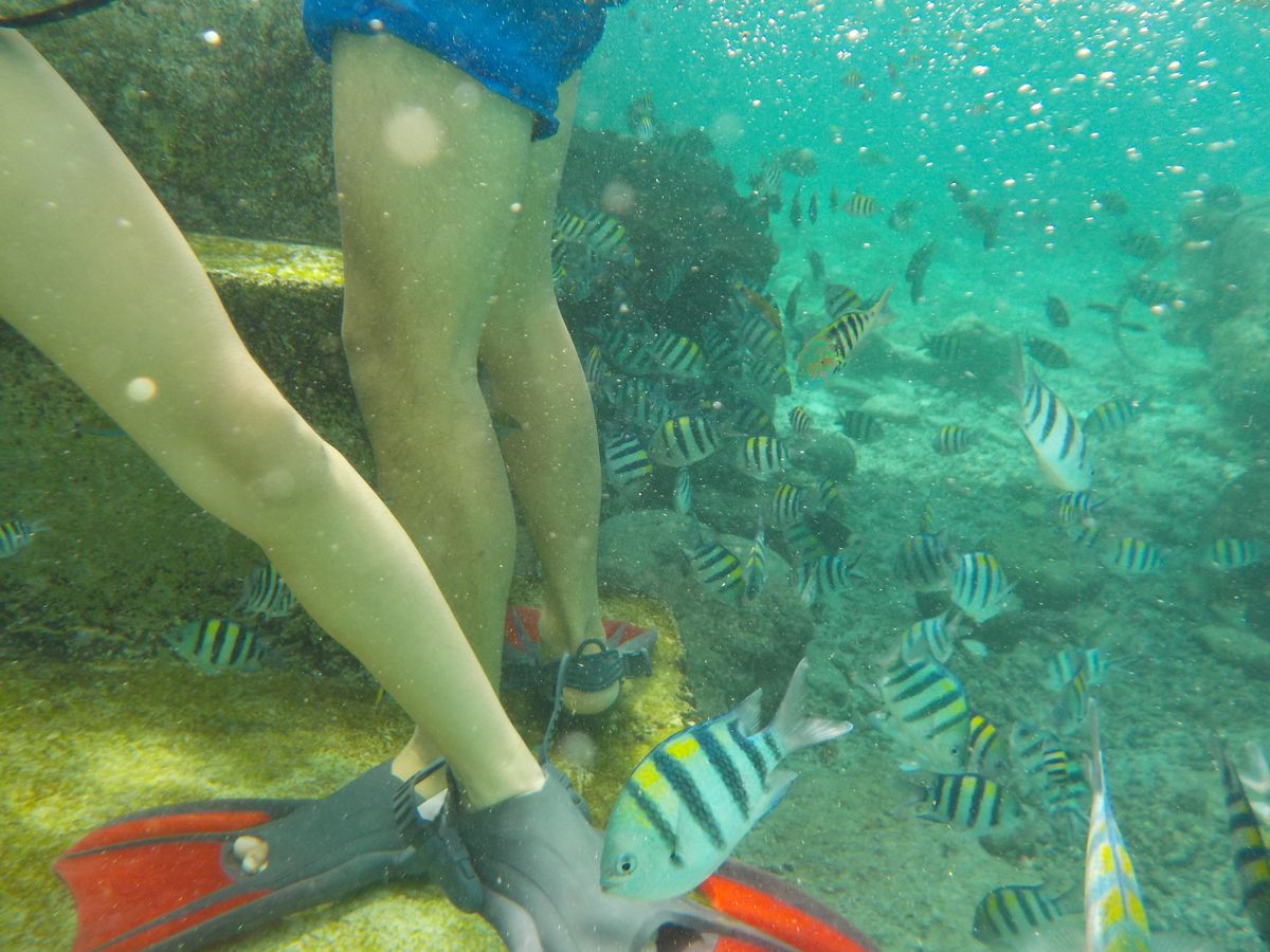 その日はたまたま参加者がショップへ集合するのが早く、ここのでシュノーケリングの時間をたくさんとっていただけました。シュノーケリング中はガイドの方がパンを使って魚を呼び寄せてくれて、大小様々カラフルな熱帯魚たちを見ることができました。