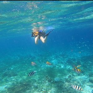 潮の満ち引きの関係で、スルパ島の白い砂浜は見ることが出来ず、残念でしたが、透明度はさすがでした。シュノーケルでは、綺麗な魚たちが見れました。乗組スタップさんが潜って写真を撮ってくれたり、海が不安な娘に浮き輪を貸してくれたり、とても親切にしていただきました。そして、初GoPro‼︎丁寧に使い方を教えていただき、水中での動画撮影、写真を楽しみました。接続しての送信がうまくできず、その日の夕方、LINEで送っていただきました。日本人のスタッフさんもとても親切で心遣いもありがたく、忘れならない思い出となりました。