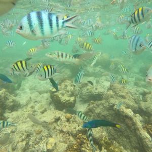 ヒルトゥガン島では魚がたくさん集まるポイントで船から降りて自由にシュノーケリングができました。