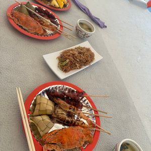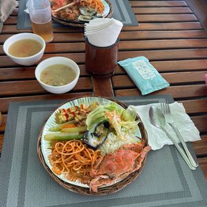 船へ戻って、船上でシーフードとフルーツを提供してもらいました。私はシュノーケルで波酔いしてしまい、マンゴーしか食べられませんでしたが、ご飯もとても美味しそうでした。