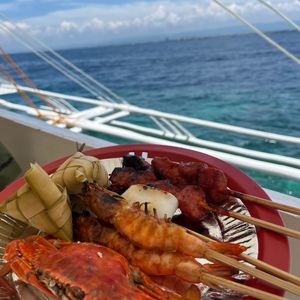 船で1人ずつにバーベキューが用意されてあって、フルーツのマンゴーもとても美味しかったです。船上は風があるので、上着は絶対必要です!