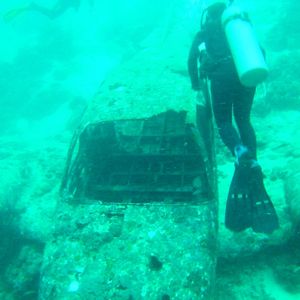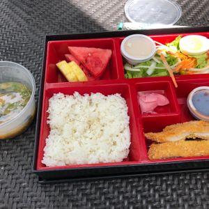 そして、午前の部が終わり、一旦陸上へ。昼食は、「トンカツ弁当」現地に行くまでは、何でセブ島まで行って和食なんやろ?って思っていましたが、これが大正解!フィリピンの食事は大して美味しくもマズくもなく、同じような串焼きばっかりだったので、偽物の和食じゃなくて、ちゃんとした和食で、久々の「わかめの味噌汁」に、癒されました!やっぱり日本人やわ(笑)次のダイブまでは、1時間の休憩です。午後からは、別のインストラクターと共に、船で沖に出て、船からのダイブです!(ちなみに、すでにカメラの充電が無くなってしまいましたが、別料金で、専属カメラマンが撮影してくれて、USBでデータごと貰えるという事なので、せっかくの記念に依頼する事にしました!)結構、沖に進んだのち、いきなりの、逆さまダイブ?!いわゆるテレビで見かける飛び込み方です。マジかよーと思いましたが、案ずるより産むがやすし、息子も難なくクリア!午前のダイブでコツを掴んだようで、2回目は、すんなり海底へ!正確な数字はわかりませんが、7〜10メートルくらいでしょうか。正直、日本国内では、初心者にこんな体験させて貰えないと思います!海底には、珊瑚礁が広がり、イルカや石像のオブジェがあるゾーンもありました!もう一段深い所は、危険なので降りれませんでしたが、まるで別世界!正直、可愛い熱帯魚は、午前のスポットの方が多くいたように思いますが、魚よりも深海の探査気分で、潜水している事自体をを満喫しました!気がつけば40分のダイビング!相当体力を消耗しましたが、息子も大喜び!お迎えの船にピックアップされて、スコッティーズオフィスへと戻りました!(楽しみにしていた写真なのですが、カメラマンの操作ミスで、飛び込む瞬間のビデオが撮れていなかったものの、お詫びにアクセサリーをプレゼントしてくださり、終始ハートフルで、真摯に対応して下さるお店でした!)