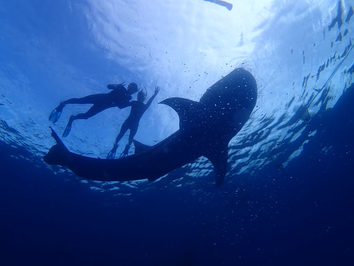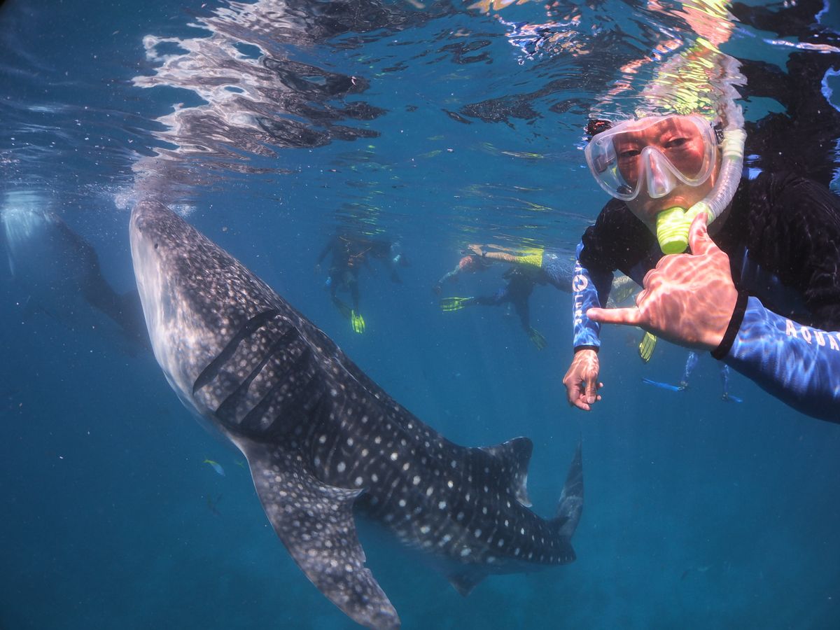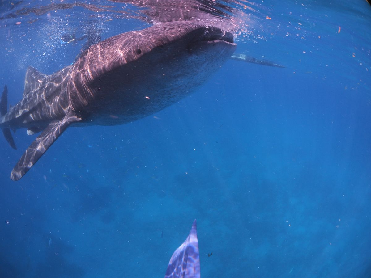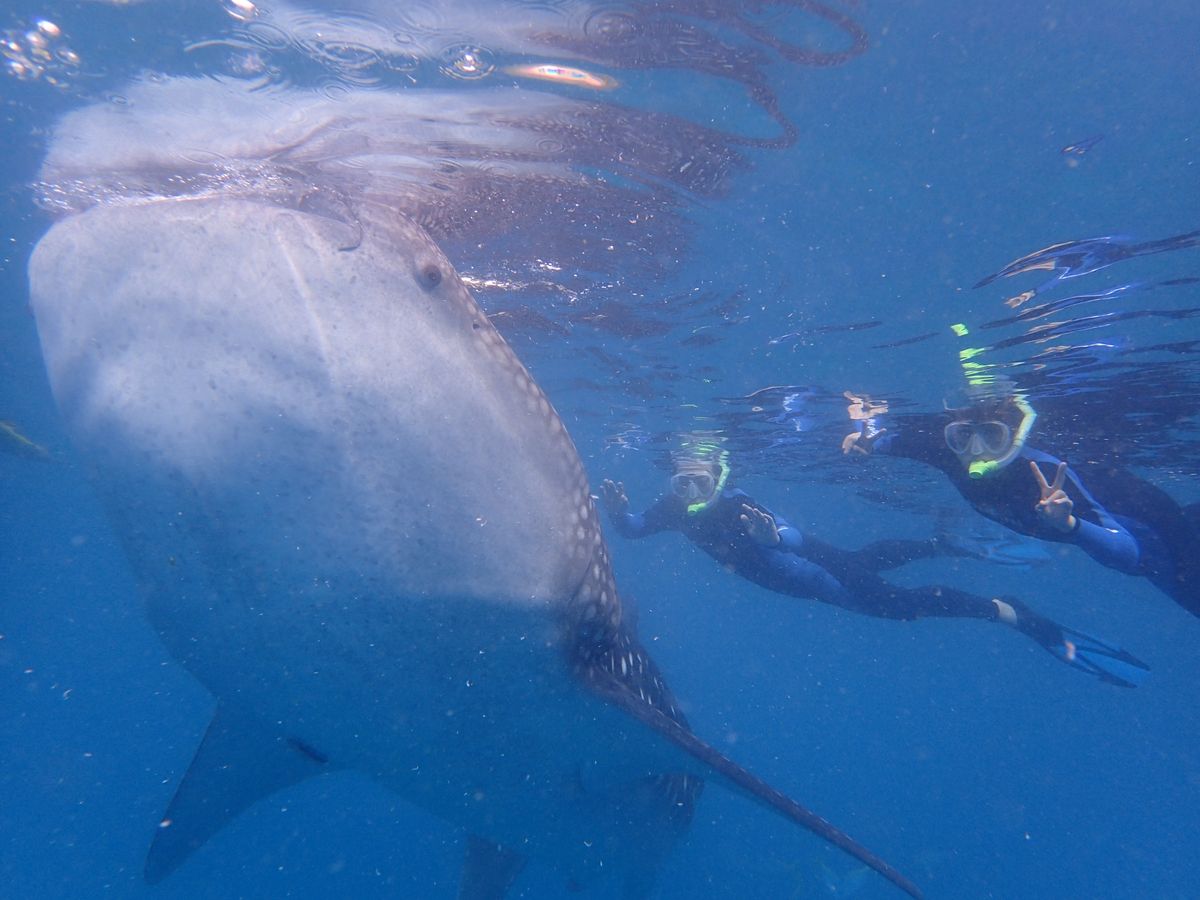 やっと順番が回ってきて、ボートに乗り込み数十メートル進んだところで海にドボンと飛び込んだら、すごく透明度の高い海に悠々と泳ぐジンベエザメがそこにいました。
