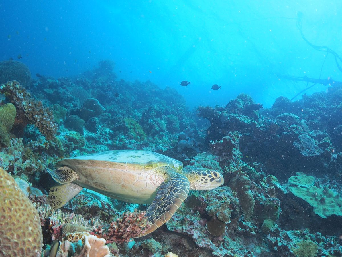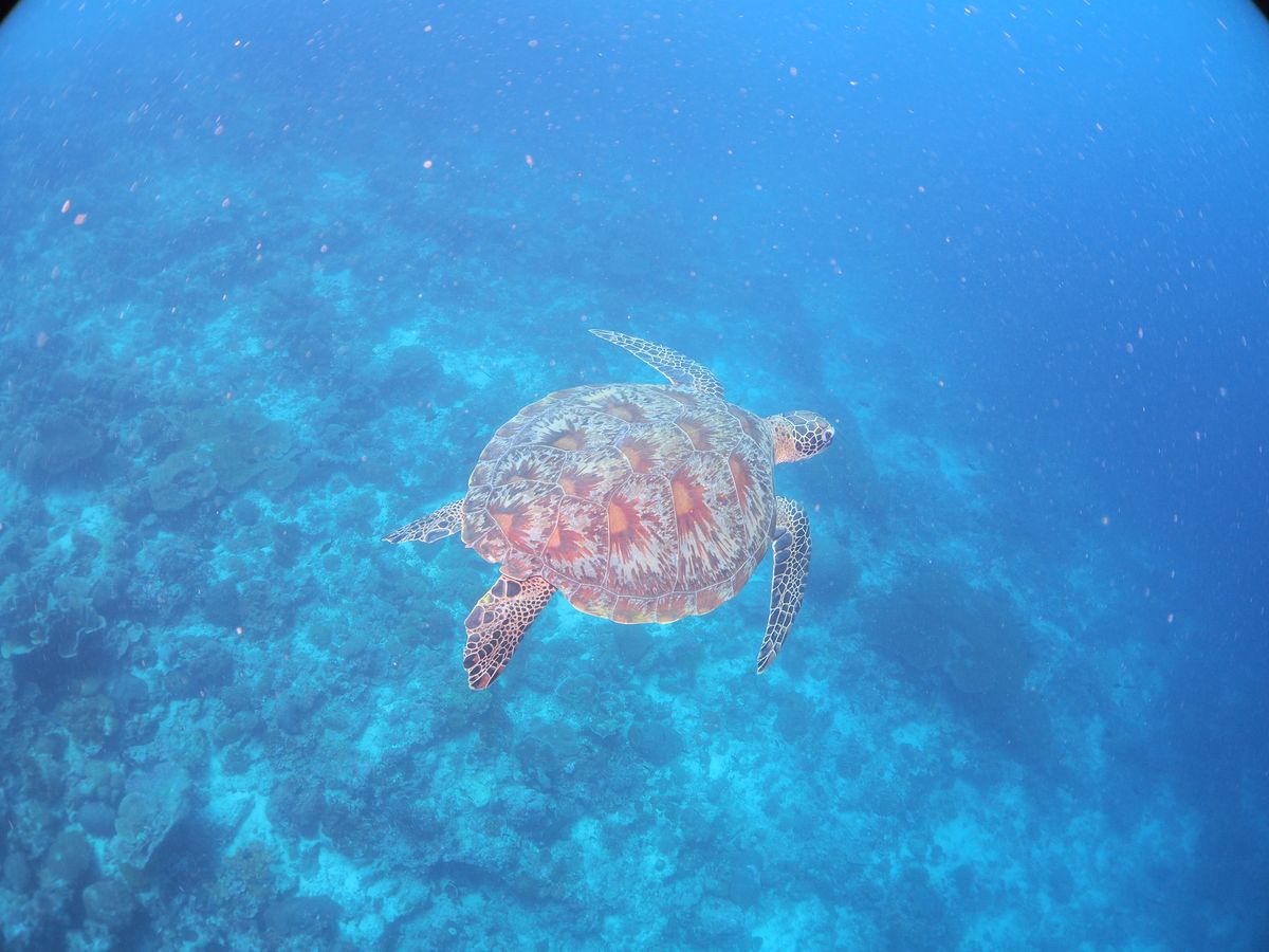モアルボアルでの海は濁りが強めでしたが、ウミガメがすごく近くに来てくれて、危うくぶつかりそうになるくらいでした。