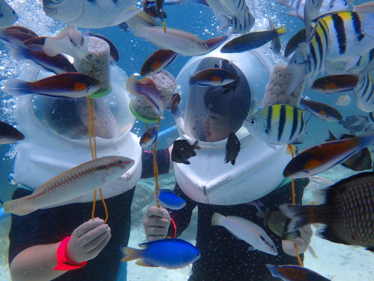 シーウォーカーは初めての体験でドキドキしました。海底で餌の入ったボトルを振るとたくさんの魚たちがやってきてとても良い経験が出来ました。カメラを頼み、たくさんの写真を撮ってもらい思い出が出来ました。バナナボートも初めてだったんですが、爽快で気持ち良かったです。シュノーケリングもまた初めてで足のつかないところを泳ぐということで大丈夫なのかと思ってたのですがライフジャケットを着たままだったので安心でした。魚もたくさんいて綺麗な海で最高。潮の流れが早くすぐに流されていたけれどとても楽しかったです。