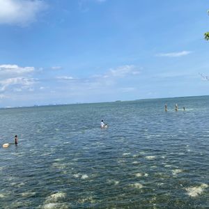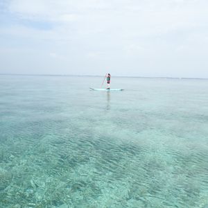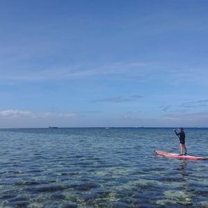 SAPの練習があると詳細には書いていましたが実際にはなくいきなり乗ってスタートでした。今回初めてのSAPで心配しましたが出発前のSAPの説明を思い出し、また1人のスタッフもSAPで同行してくれ間違っていると教えてくれたのでなんとかスタートできました。私が一番後ろで遅れてましたが私のスピードに合わせてずっと後ろから来てくれました。途中でみなさん何度か転落していましたがそのつどスタッフが近くまで来てくれ引き上げてくれたので大丈夫でした。また、友人とワイワイしながら行くと言うより、個人で黙々と島を目指す感じです。この日は曇りだったので特に帽子等は必要なかったですが、天気が良い日は絶対に帽子がないと頭が日焼けして痛くなること間違いなしです。1つ残念だったのが、島に上陸できると思ったのですがタイムオーバーだったのかわかりませんが上陸する島までもう一踏ん張りのところで舟に上がるように指示され島に上陸できずにアクアマリンに帰ってきたことです。
