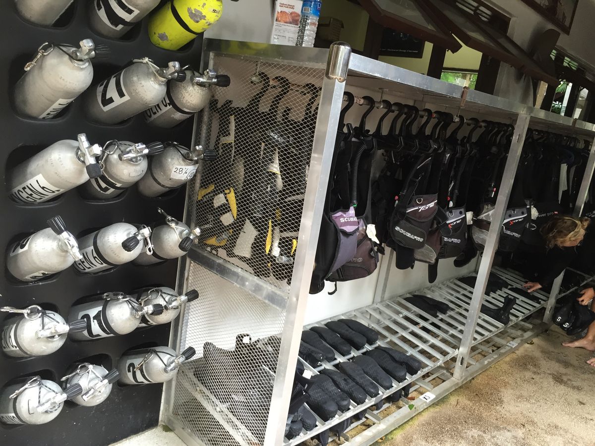 時間通りにバスが迎えに着てホテルからエメラルドグリーン・ダイビングセンターに到着。日本人スタッフや現地の方々が優しく丁寧に対応。不安なくダイビングの準備へ。