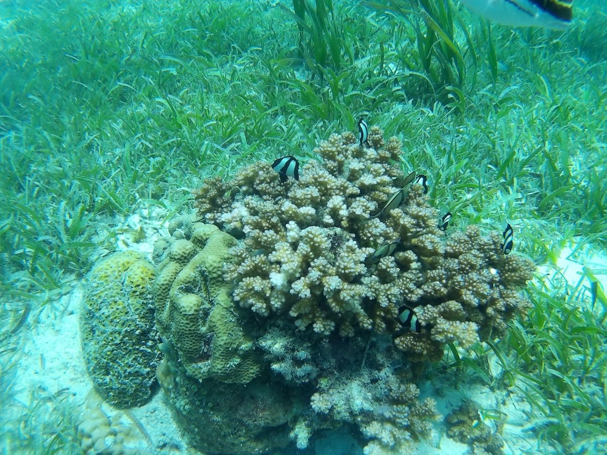 まず初めに、ビーチの浅瀬で用具の使い方について30分程度練習した。ボンベの使い方やトラブルの対処など潜りながら練習をすることができました。さらに、水中でのサインなどを確認し、習ったことを確認しながら実習をするので、一人一人のペースに合わせて指導してくれました。