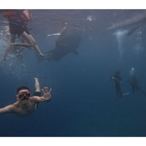 ジンベイとのまさに“夢のような瞬間”です。オスロブの透き通る海の中、ジンベイと並んで泳げ、感動と興奮がとても印象的です。ジンベイの優雅な泳ぎと、自然な一体感がまるで海の物語のようです。