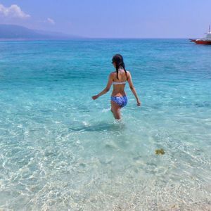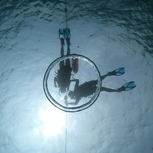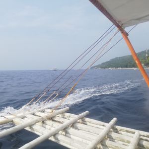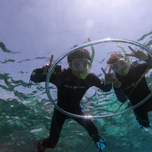 船の周りを泳ぎ魚などを見ることが出来ました。底が深かったため近くでは見れなかったけど、海が綺麗で透き通っているため魚の姿をはっきりと見えました。
