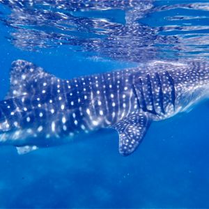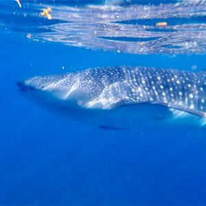 待機している船の間を、小型のボートが餌を撒きながらジンベイザメを誘導し往復している感じで、何度も目前でジンベイザメを見ることができました。ジンベイザメが近くに来ると船から船頭さんも声をかけてくれるので、見逃すことはないと思います。複数頭いるのか、一度に2頭見られることもありました。ぶつかるんじゃないかと思うほど目の前で大迫力で見ることができて本当に満足です。
