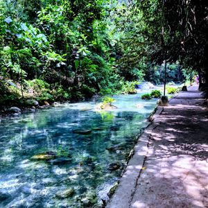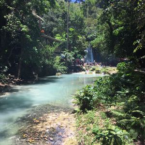 カワサン滝近くの駐車場に到着後は30分ほど歩いて滝まで向かいますが、その途中も日本では決して見られないような南国の森とエメラルドグリーンの綺麗な川を見なられるため、滝まであっという間に感じました。