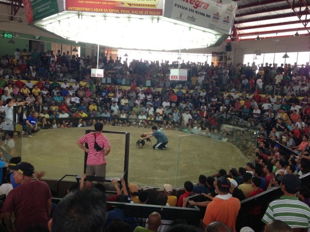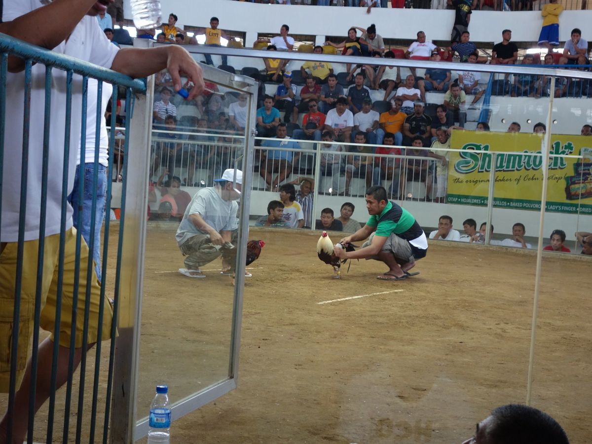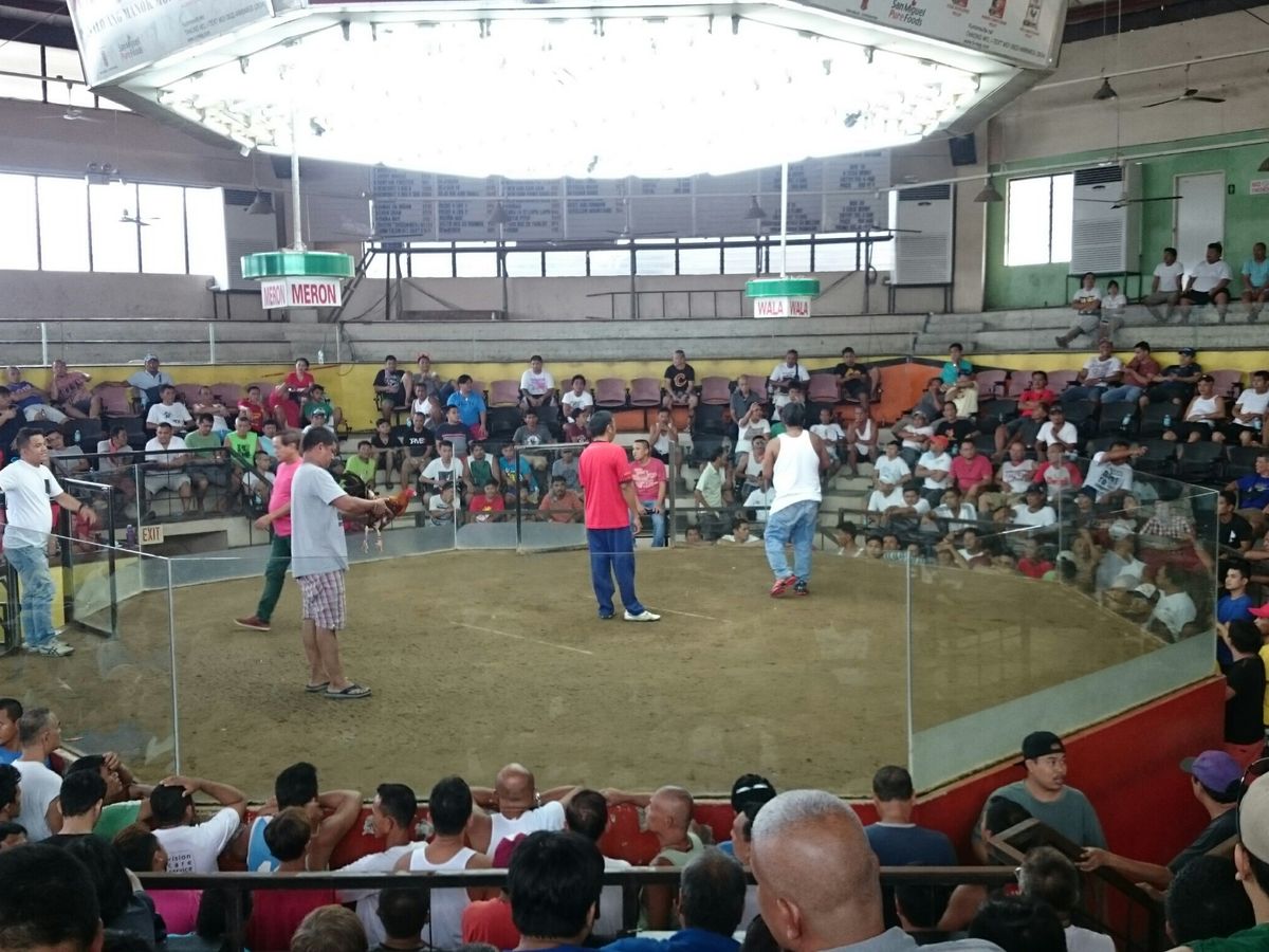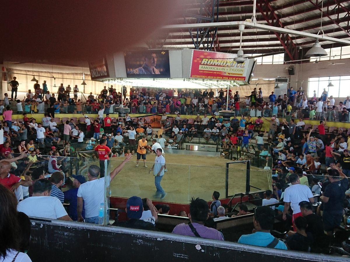 フィリピンの数少ない娯楽の一つでセブでも人気が高いと聞いていたので、とても楽しみにしていました。前日の深夜到着でしたので、午前中はホテルでのんびり過ごし14:00にガイドさんにホテルまで迎えに来てもらい、車に乗ること約30分~40分、車窓からの街並みや現地の生活状況などを聞きながら、日本とだいぶ環境が違うなどと思いながら会場に到着しました。会場はのどかな街並みとは違い、何やら殺気だったような空気と歓声で盛り上がっており、雰囲気に圧倒されながら会場入りをしました。