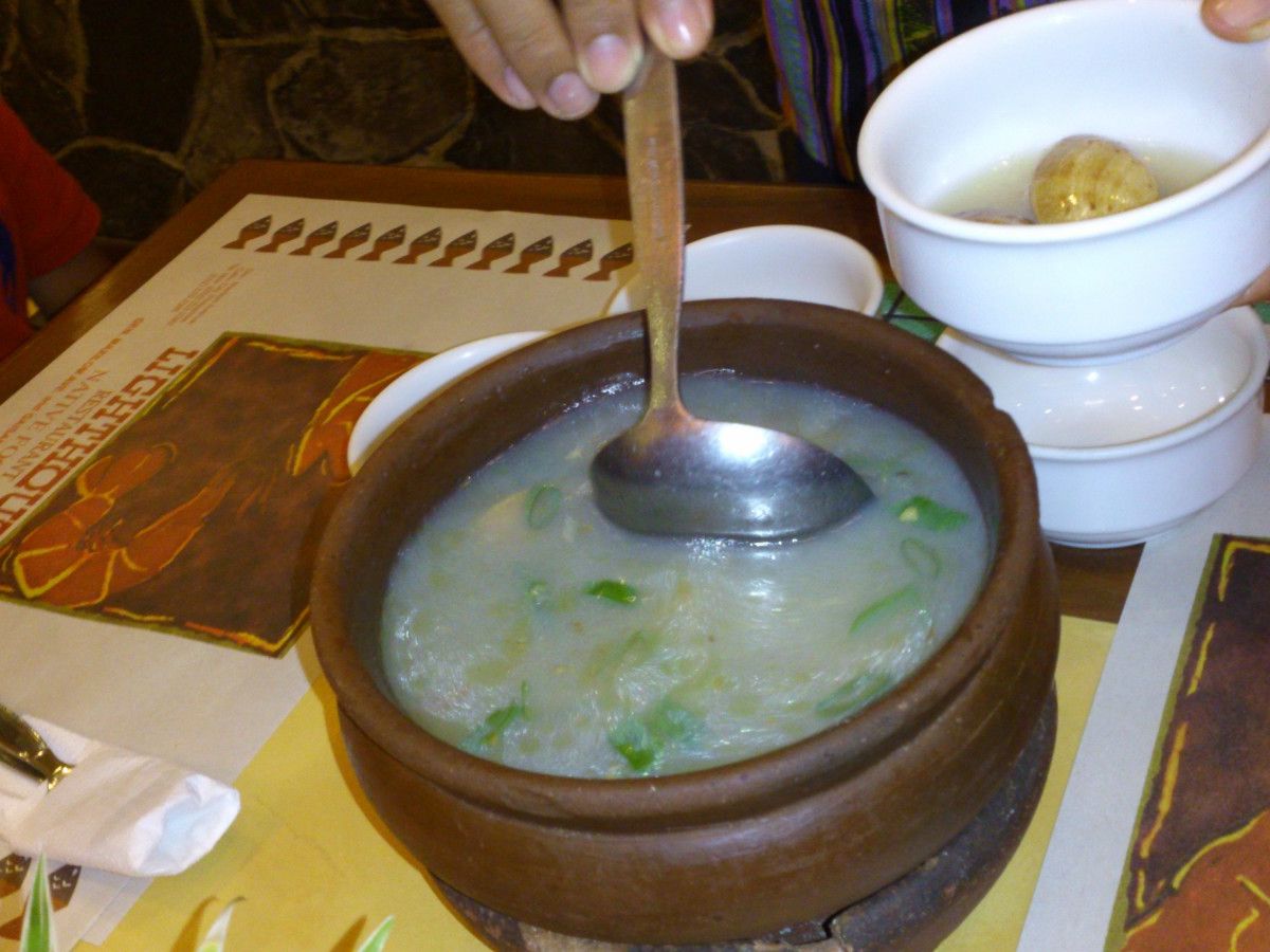 闘鶏場に着き観戦席までの移動中は、殺伐とした雰囲気にやや気後れしましたが、場内に入るとギャンブル中の人たちから闘鶏見物に最良の席を譲ってもらいそこで見学となりました。そして闘鶏の見学です。闘鶏は次々とおこなわれ、迫力ある戦いに見入ってしまいました。同行した娘にはショッキングであったようですが、ちょっと残酷ですが一方の鶏が動けなくなるまで戦う様子といい、一対一でおこなわれる賭けといい日本ではあまり目にすることのない貴重な体験となりました。同行したガイドさんが一生懸命説明してくれるのですが、日本語があまり理解できなく、賭けに参加することは出来ませんでしたが、雰囲気だけでも十分楽しめました。闘鶏を見学した後、ショッピングモールのようなところにある、フィリピン料理レストランで郷土料理を食べましたが、最初に出てきた大きな貝のスープは?マークがつきましたが、その他の料理については大変美味しくいただきました。量も十分で満足しています。余談ですが娘の話ではこのレストランのスイカシェイクはセブ島で飲んだシェイクの中で一番美味しかったそうです。