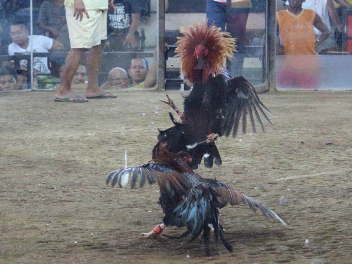 日本の闘鶏とは異なっており、鶏の脚にはナイフを装着し、