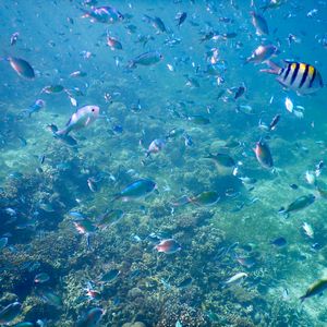 透明感の高い水中でたくさんの色とりどりの熱帯魚やサンゴなど、