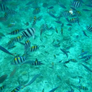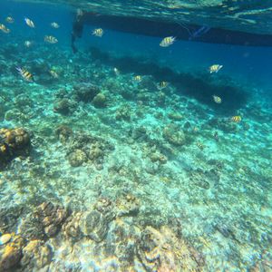 ヒルトゥガン島でのシュノーケリングでは、綺麗な海の中でたくさんの魚たちを見ることができました。