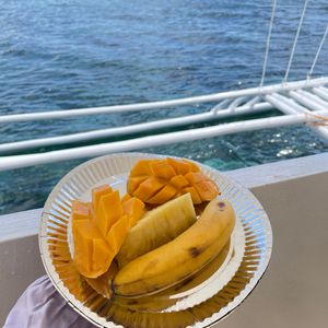 次の島までの移動中にお肉たくさんとお米、マンゴーとパイナップルをいただきました!アルコール飲み放題のプランだったのでビールもいただきました!全部美味しかったです!