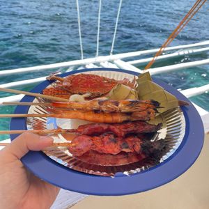 ランチの船上ランチはフィリピン料理の代表的な家庭料理メニューとフィリピン風BBQを準備しております。フィリピン料理は日本では馴染みがないですが、生姜やニンニク、醤油を使う料理が多いので日本人にも親しみやすく多くの方に好評をいただいております。特にモリンガ入りのチキンスープは大人気で、海で泳いだ後の冷えた体にぴったりのメニューです。