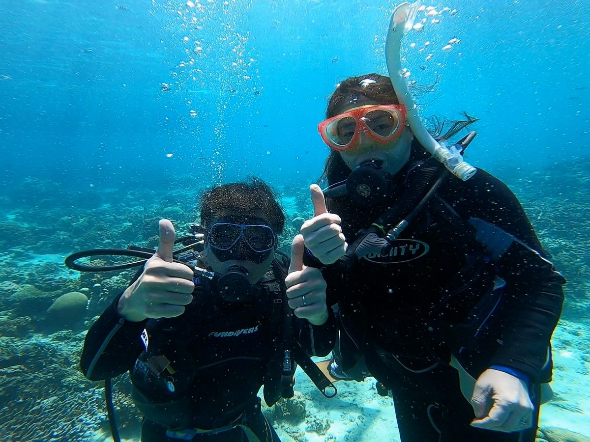夫婦で参加しました。天候に恵まれなかなか見れない魚もたくさん見れて、海の中は別世界。体験でここまで楽しめるなんて、本当に感動しました。何より、スタッフが一人づつついて、しっかりサポートしてくださったおかげで安心して体験ダイビングを楽しめました。
