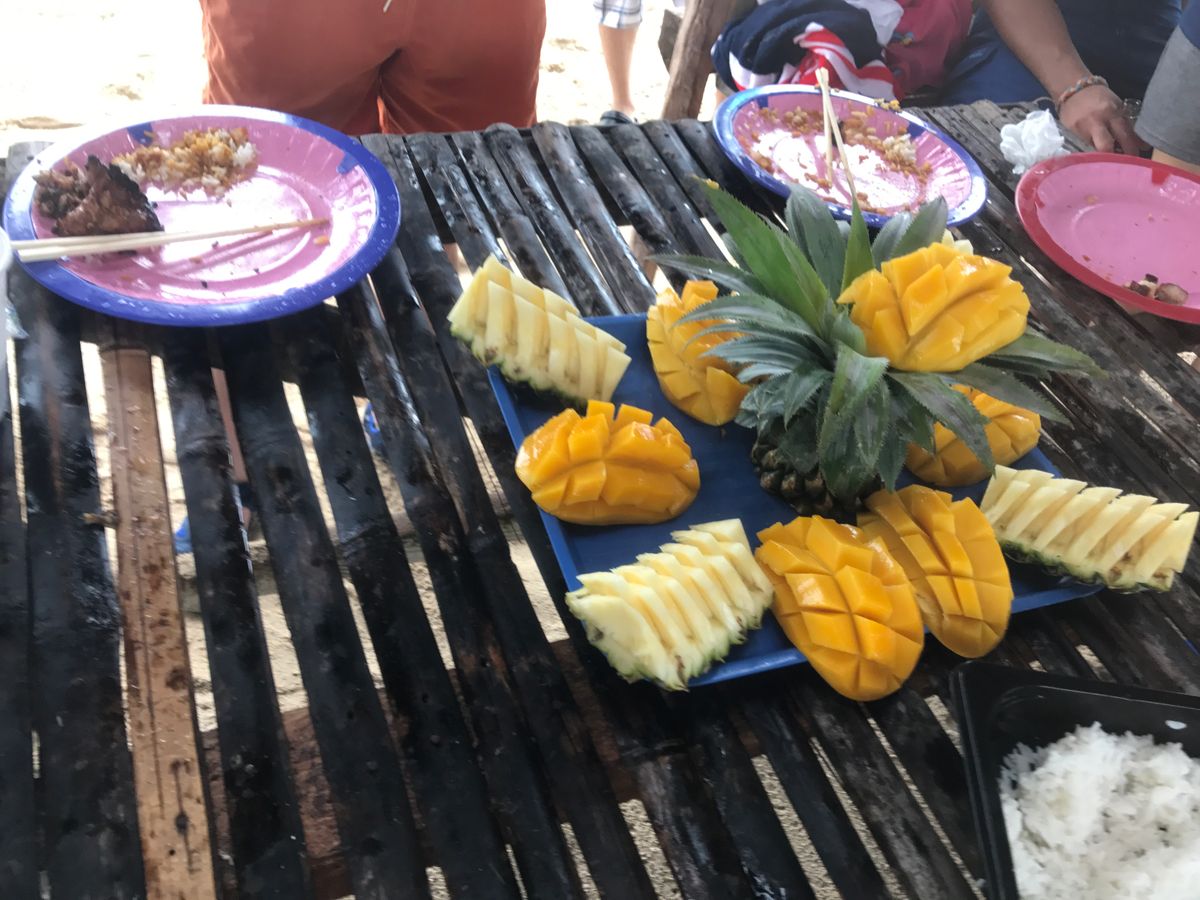 最初にダイビングを体験しました!丁寧にスタッフの方が教えてくださり難なくダイビングを楽しめました!特に印象に残ったのはダイビング中にスタッフの方が餌をくれてそれを自分達で散らばすことによって魚が寄ってきてとてと美しい光景が見られたことです。魚も見たこともない長細い黒と白の綺麗な魚たちがいました!その瞬間もスタッフの方が超いい感じに写真を撮ってくれてその場の光景が物にもなりました!パンダノン島に着くまえの綺麗すぎる景色、島についてからは島の周りを見て、ため息が出ました。完全に興奮してましたねわたくし。あとは美味しいお肉とフルーツたちが僕らの胃袋をつかみました!ダイビングあとからはずっとビールも飲める、飲めない彼女はフルーツジュースなんて最高のシチュエーションなんでしょうか……