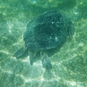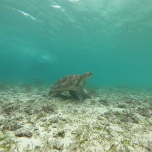 島の反対側に移動し、次のスポットへ向かいます。これも約1時間半くらいです。このスポットでウミガメとイワシの大群と会えます。こちらはスーツは着ずに水着の上からライフジャケットを着用。(日焼けが気になる方はラッシュガードを着た方がよいです!着ても結構焼けます。)ウミガメは泳いで探しながらという感じでした。その日はなかなかいなくて、もう諦めようかと思っていた時に一匹のウミガメが近づいてきてくれました(T_T)会えたときは感動です!