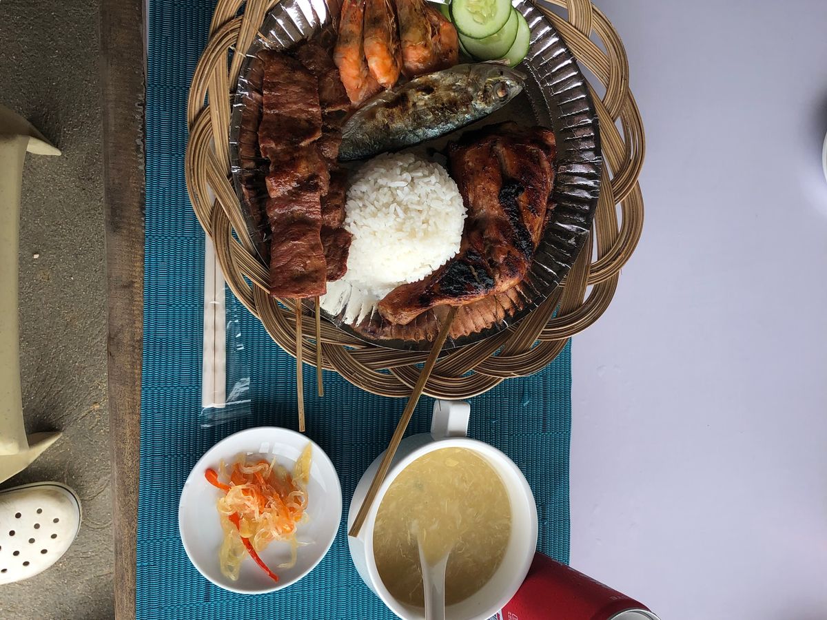 ついてすぐはお昼ご飯(≧∇≦)海をバックにチキンと肉と色々とセブの料理が出てきました。