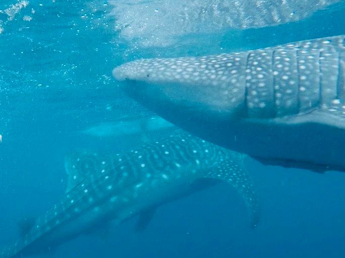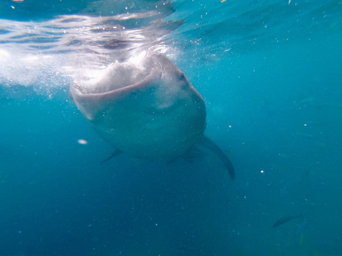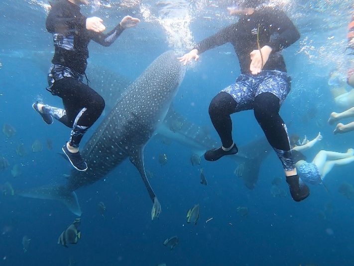 4時20分にホテルでピックアップしてもらい移動時間は4時間の予定でしたが1時間早く現地に着きました。順番待ちをした後、小船ですぐいったところにたくさんジンベエザメがいました。30〜40分ほど海に入る時間がありその間にスタッフの方が写真を撮ってくれます(スタッフへ250ペソ必要)。なので絶対にGoProはあった方がいいと思います。想像よりたくさんのジンベエザメに会えて満足できました。注意する点は日焼け止めが禁止されていること、そこまで気にする必要はなかったですがジンベエザメに触れると罰金が発生するところです。ただほんとに近くにいるのでとても迫力があります!!