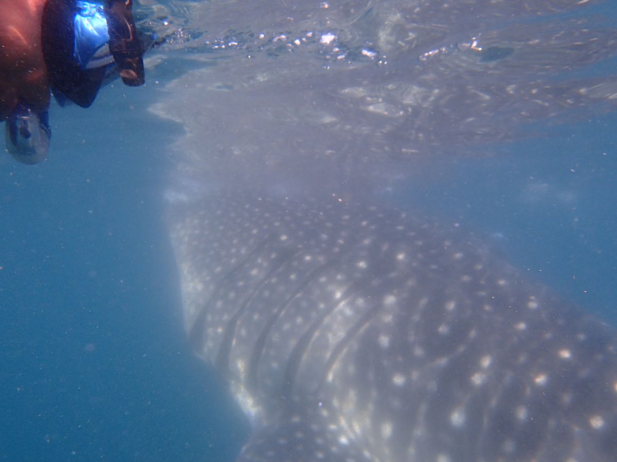 ジンベイザメのポイントに到着する前に、ジンベイザメに対しての注意点のメモ、署名をして出発。ビーチから小型のカヌーのような舟に乗って少し沖に出ると、迫力のある大きさのジンベイザメザメが4,5頭?水面に近い場所にいるので深く潜る必要はありませんでした。